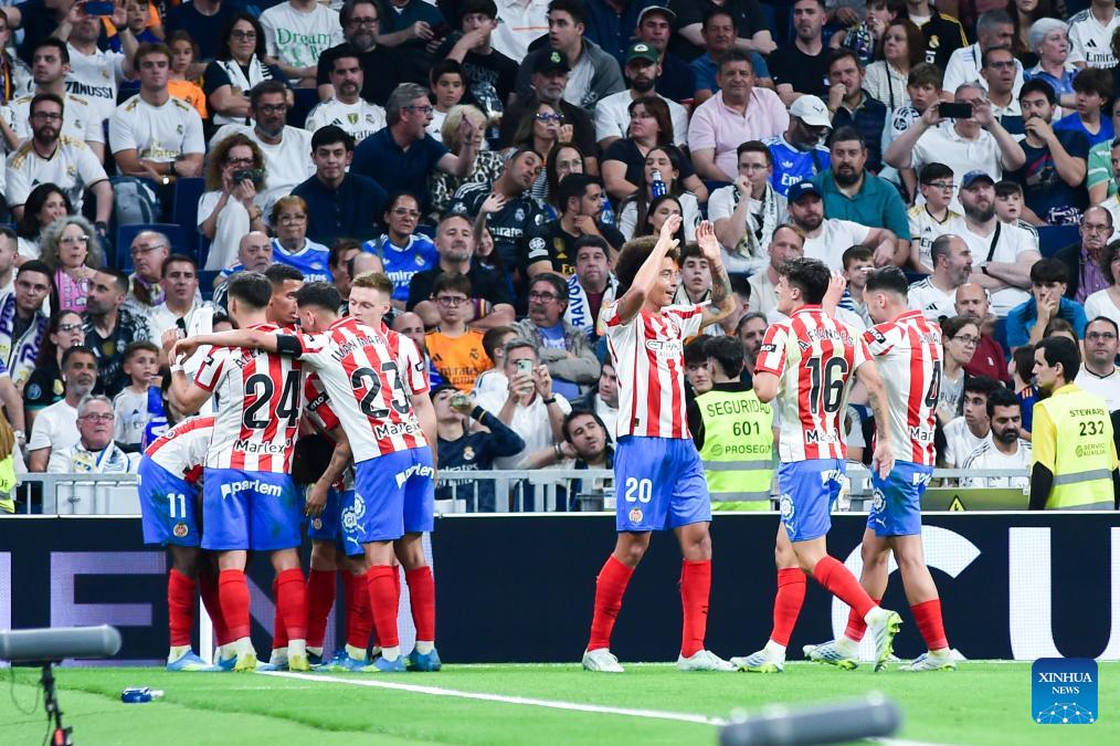 Girona F.C.'s players celebrate scoring during the LaLiga football match between Real Madrid and Girona F.C. in Madrid, Spain, on April 10, 2026. (Photo by Gustavo Valiente/Xinhua)