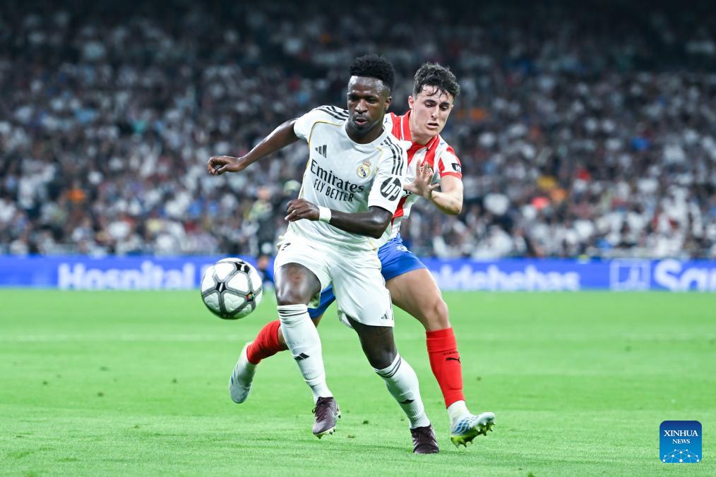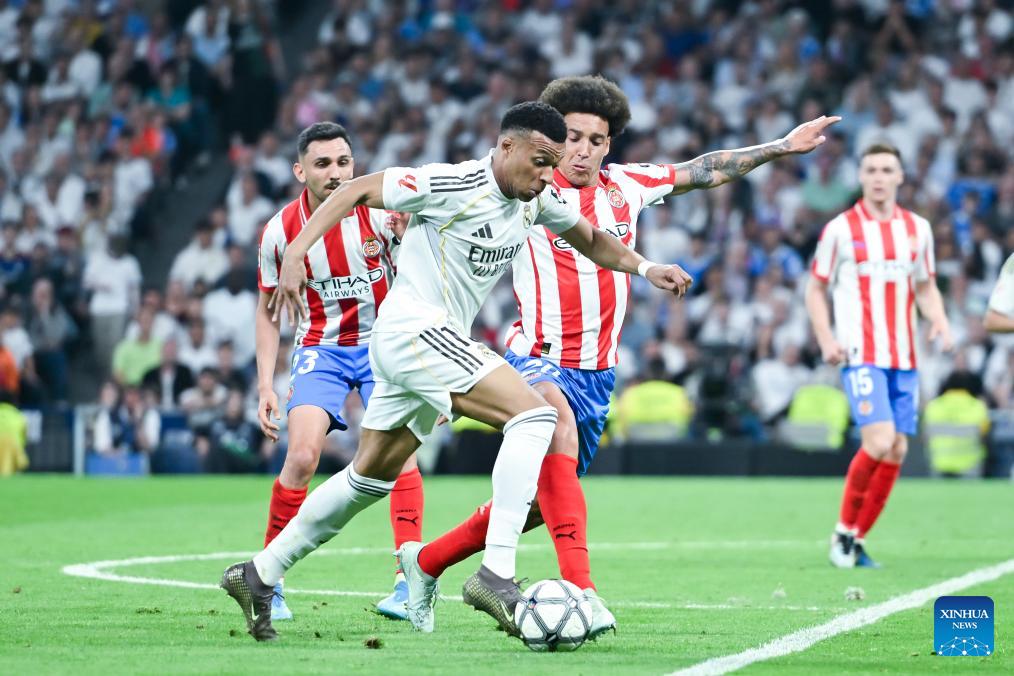 Real Madrid's Vinicius Junior (L) vies with Girona F.C.'s Alejandro Frances during the LaLiga football match between Real Madrid and Girona F.C. in Madrid, Spain, on April 10, 2026. (Photo by Gustavo Valiente/Xinhua)