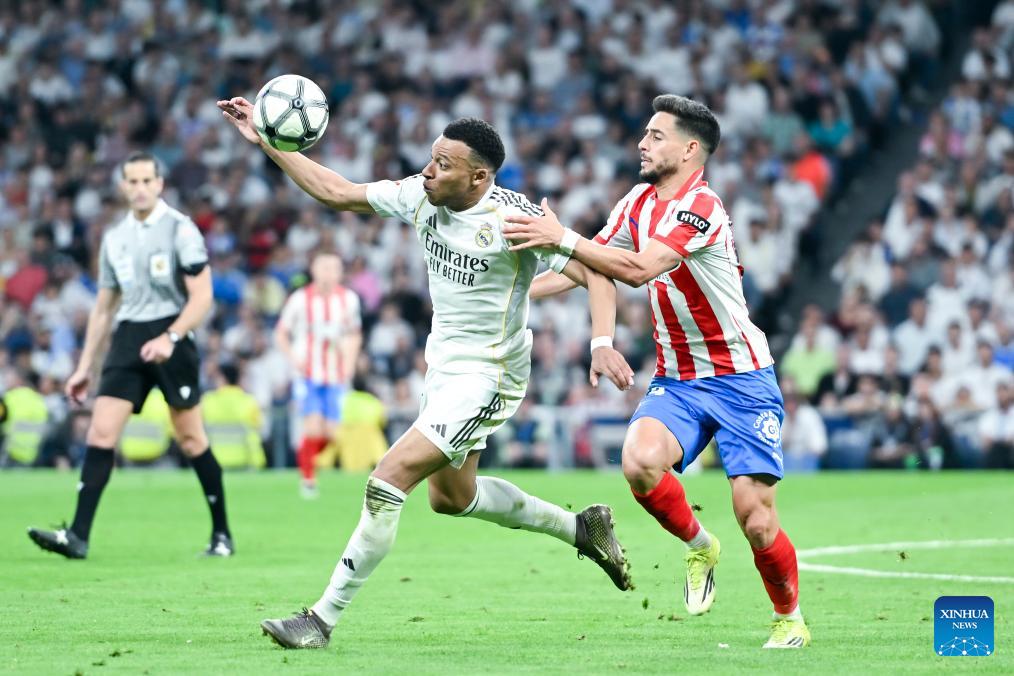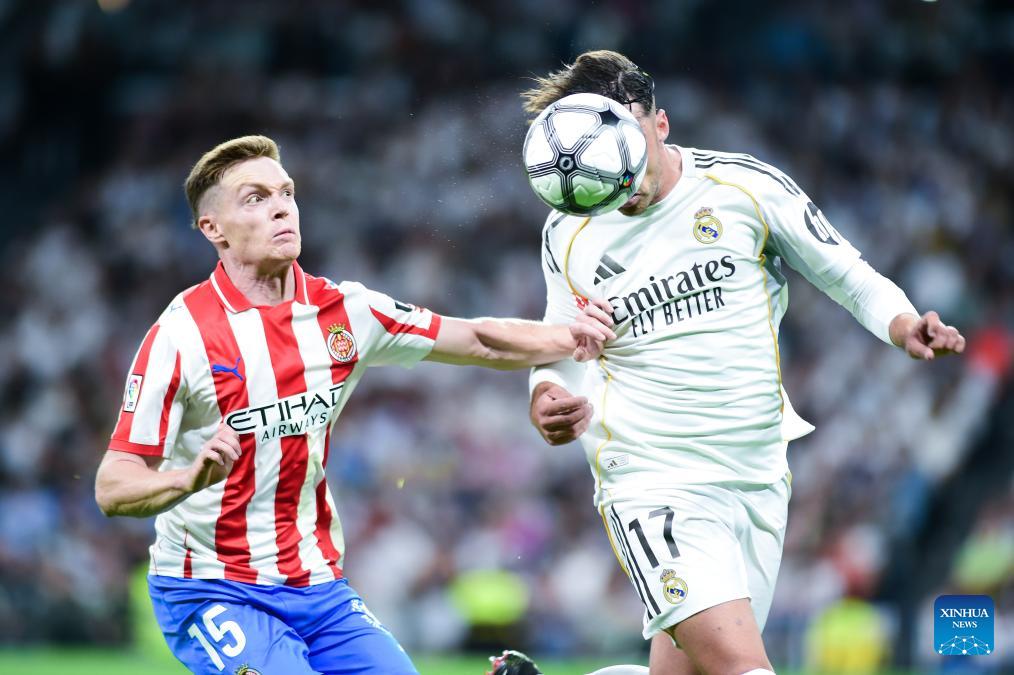 Real Madrid's Raul Asencio (R) vies with Girona F.C.'s Viktor Tsygankov during the LaLiga football match between Real Madrid and Girona F.C. in Madrid, Spain, on April 10, 2026. (Photo by Gustavo Valiente/Xinhua)