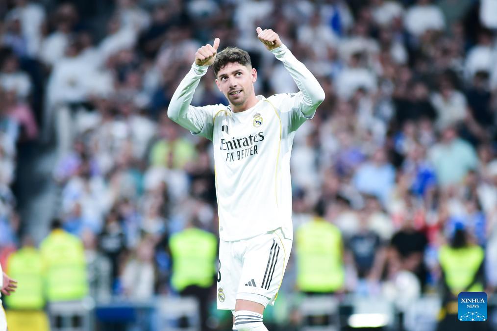 Real Madrid's Federico Valverde celebrates scoring during the LaLiga football match between Real Madrid and Girona F.C. in Madrid, Spain, on April 10, 2026. (Photo by Gustavo Valiente/Xinhua)