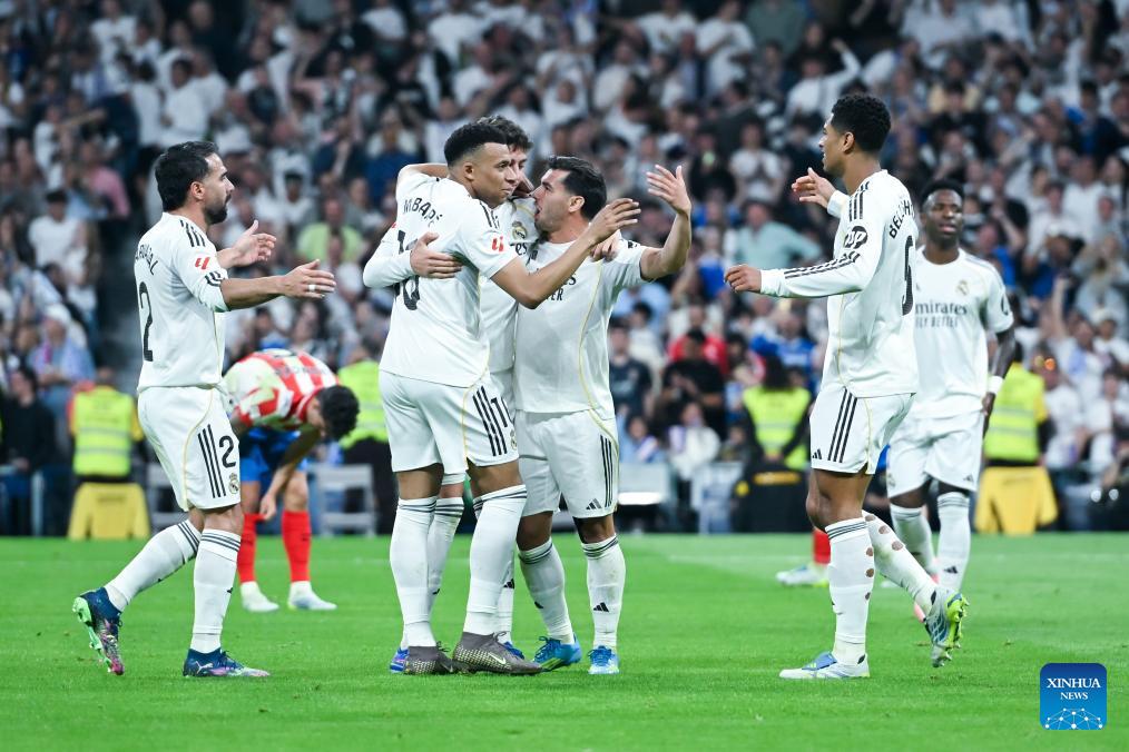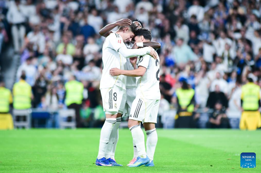 Real Madrid's players celebrate scoring during the LaLiga football match between Real Madrid and Girona F.C. in Madrid, Spain, on April 10, 2026. (Photo by Gustavo Valiente/Xinhua)