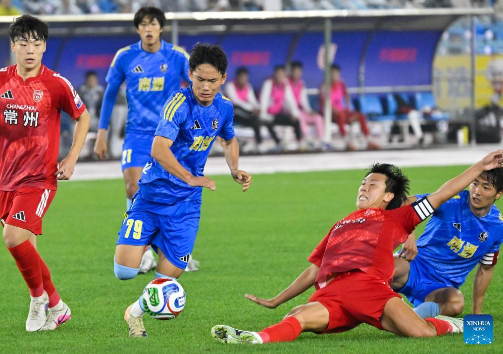 Zhang Xiangdong (3rd L) of Nantong competes during the opening match between Changzhou and Nantong of the 2026 Jiangsu Football City League in Changzhou, east China's Jiangsu Province, April 11, 2026. (Xinhua/Ji Chunpeng)