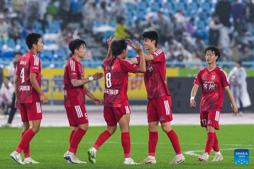 Players of Changzhou celebrate victory after the opening match between Changzhou and Nantong of the 2026 Jiangsu Football City League in Changzhou, east China's Jiangsu Province, April 11, 2026. (Xinhua/Li Bo)