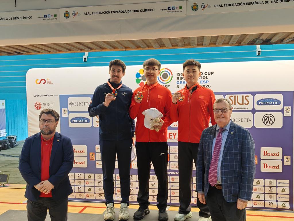 Zhang Changhong (C) and Liu Yukun (2nd R) pose on the podium after the men's 50-meter rifle 3 positions at the ISSF World Cup, in Granada, Spain, on April 12, 2026. (Photo: Xinhua)