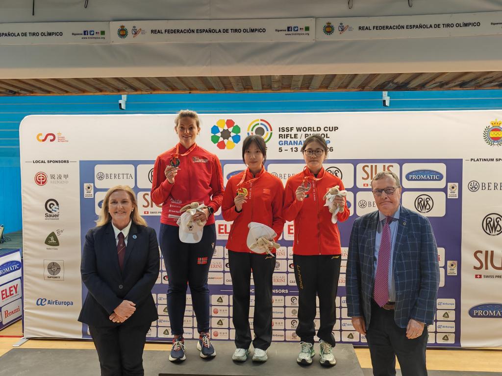 In the women's 10m air rifle final, Wang, 19, rallied from fourth place to claim her second gold of the Granada World Cup with 252.9 points.
