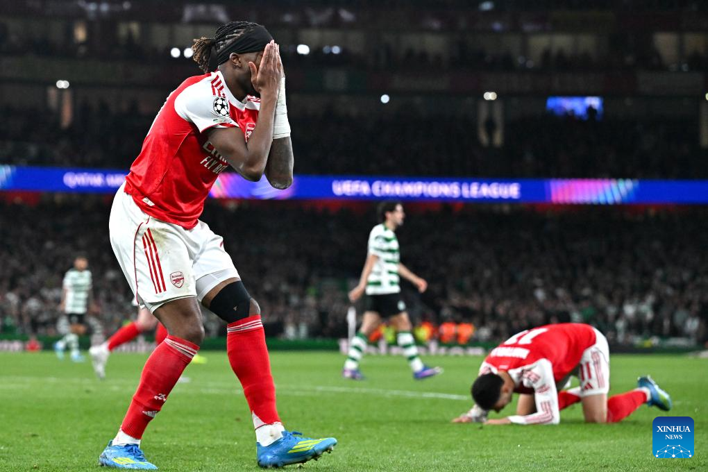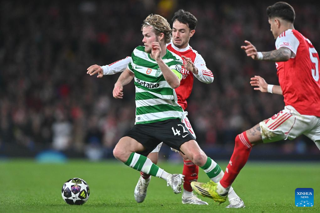 Daniel Braganca (R) of Sporting CP vies with Cristian Mosquera of Arsenal during the UEFA Champions League quarterfinal 2nd Leg football match between Arsenal and Sporting CP in London, Britain, April 15, 2026. (Xinhua)