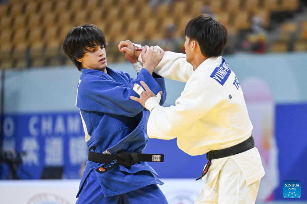 Ruslan Poltoratskii (L) of Bahrain competes against Yang Yung Wei of Chinese Taipei during the men's -60kg final at the Asian Judo Championships 2026 in Ordos, north China's Inner Mongolia Autonomous Region, April 16, 2026. (Xinhua/Bei He)