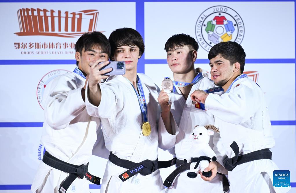 Gold medalist Ruslan Poltoratskii (2nd L) of Bahrain, silver medalist Yang Yung Wei (1st L) of Chinese Taipei, bronze medalist Tumenjargal Tuvshintur (2nd R) of Mongolia and Samariddin Kuchkarov of Uzbekistan take selfie during the awarding ceremony after the men's -60kg final at the Asian Judo Championships 2026 in Ordos, north China's Inner Mongolia Autonomous Region, April 16, 2026. (Xinhua/Bei He)