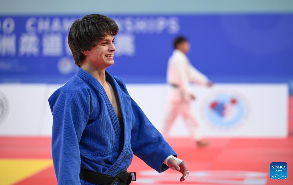 Ruslan Poltoratskii of Bahrain celebrates victory over Yang Yung Wei of Chinese Taipei during the men's -60kg final at the Asian Judo Championships 2026 in Ordos, north China's Inner Mongolia Autonomous Region, April 16, 2026. (Xinhua/Bei He)