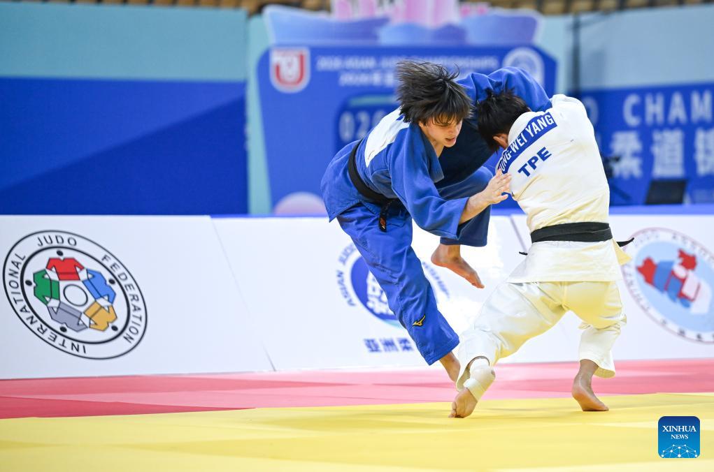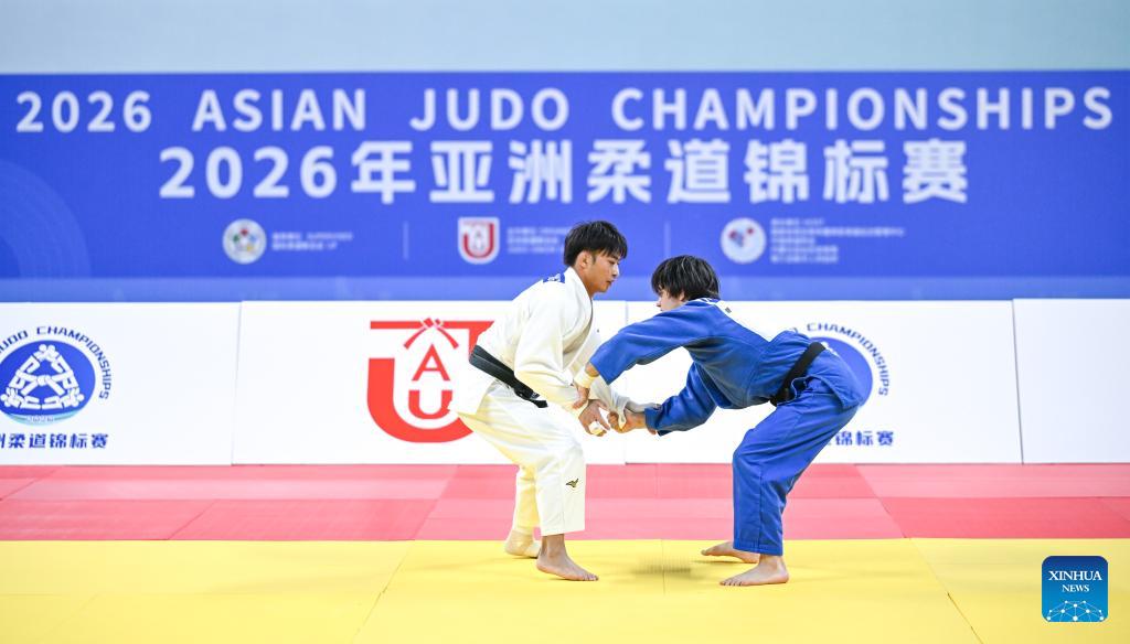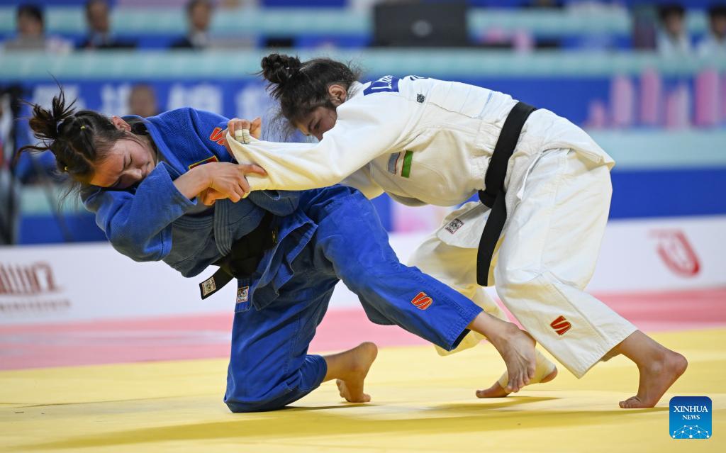 Anudari Jamsran (R) of Mongolia competes during the women's -48kg final match against Laziza Haydarova of Uzbekistan at the Asian Judo Championships 2026 in Ordos, north China's Inner Mongolia Autonomous Region, April 16, 2026. (Xinhua/Bei He)