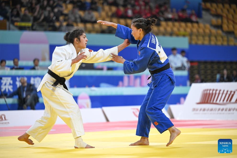 Anudari Jamsran (L) of Mongolia competes during the women's -48kg final match against Laziza Haydarova of Uzbekistan at the Asian Judo Championships 2026 in Ordos, north China's Inner Mongolia Autonomous Region, April 16, 2026. (Xinhua/Bei He)