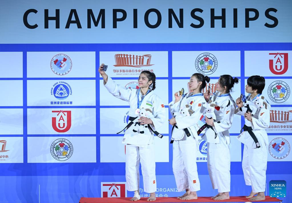 Gold medalist Anudari Jamsran (2nd L) of Mongolia, silver medalist Laziza Haydarova (1st L) of Uzbekistan, bronze medalists Zhuang Wenna (2nd R) and Hui Xinran of China pose on the podium during the awarding ceremony of the women's -48kg match at the Asian Judo Championships 2026 in Ordos, north China's Inner Mongolia Autonomous Region, April 16, 2026. (Xinhua/Bei He)