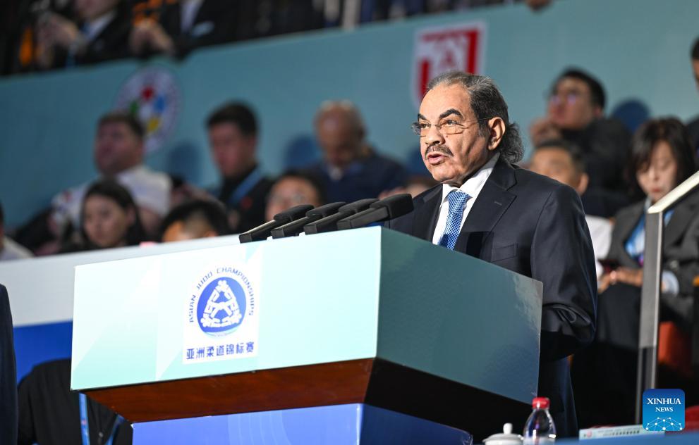 Obaid Al Anzi, president of Judo Union of Asia speaks during the opening ceremony of 2026 Asian Judo Championships in Erdos, north China's Inner Mongolia Autonomous Region, on April 16, 2026. (Xinhua/Bei He)
