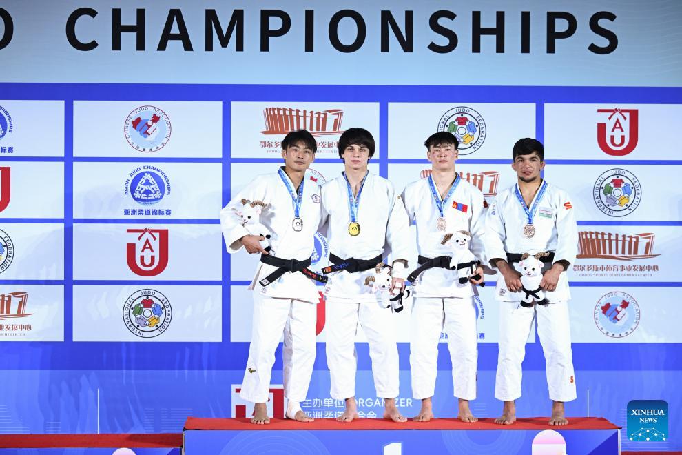Gold medalist Ruslan Poltoratskii (2nd L) of Bahrain, silver medalist Yang Yung Wei (1st L) of Chinese Taipei, bronze medalist Tumenjargal Tuvshintur (2nd R) of Mongolia and Samariddin Kuchkarov of Uzbekistan pose during the awarding ceremony after the men's -60kg final at the Asian Judo Championships 2026 in Ordos, north China's Inner Mongolia Autonomous Region, April 16, 2026. (Xinhua/Bei He)