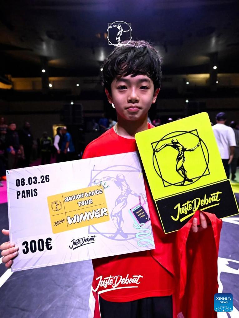 Li Yongqiu poses after winning the Junior Dance Tour at the Juste Debout 2026 World Finals in Paris, France on March 8, 2026. Li Yongqiu, a 13-year-old Chinese boy, claimed gold in Junior Dance Tour at the Juste Debout 2026 World Finals in Paris, France on March 8, 2026, making history. It is a famous street dance event and brings together the best dancers from around the world. During the finals, Li performed a special routine. He combined breakdancing moves with Kung Fu. It made a deep impression on both the spectators and judges. Li started learning breaking when he was 8 years old. He joined the Chongqing breaking team in 2022. The team helps young dancers like him grow and compete at a high level. Li trains hard five to six days a week. Even with all that training, he still finds time to keep up with school. His hard work and strong spirit helped him become a champion. (Xinhua)