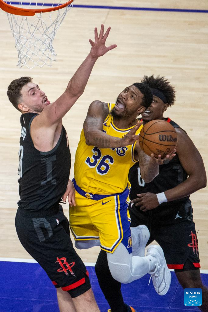 Los Angeles Lakers' Marcus Smart (C) goes to the basket during the 2025-2026 NBA first-round playoff series basketball match between Los Angeles Lakers and Houston Rockets in Los Angeles, the United States, April 18, 2026. (Photo by Ringo Chiu/Xinhua)