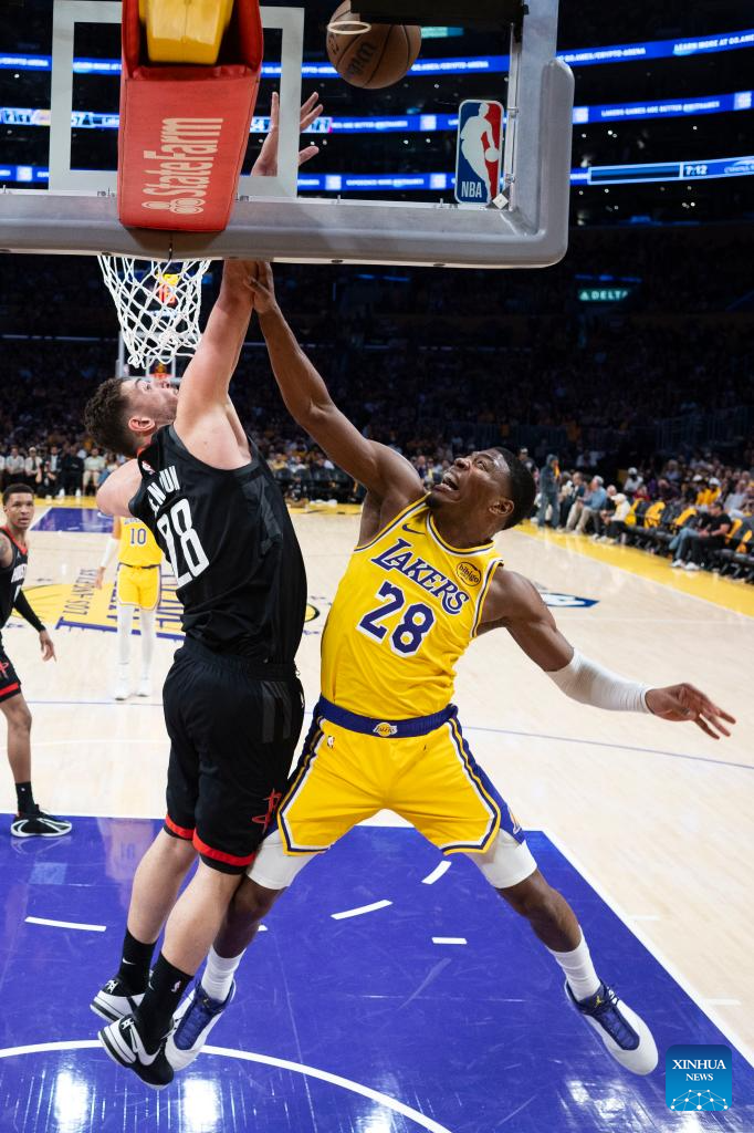 Los Angeles Lakers' Rui Hachimura (R) shoots against Houston Rockets' Alperen Sengun during the 2025-2026 NBA first-round playoff series basketball match between Los Angeles Lakers and Houston Rockets in Los Angeles, the United States, April 18, 2026. (Photo by Ringo Chiu/Xinhua)