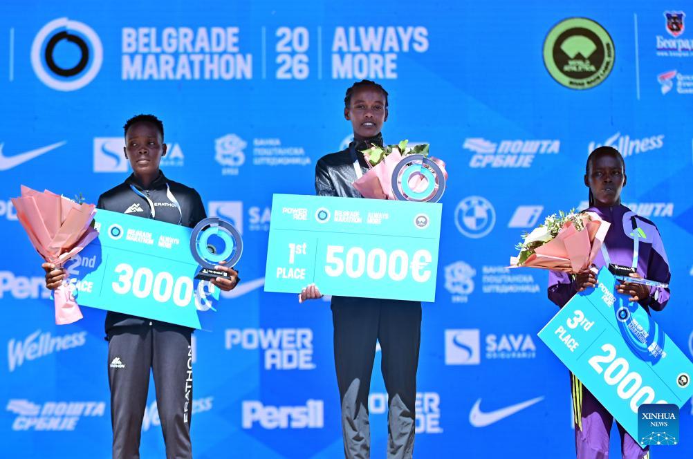 Silver medalist Kenya's Ruth Chepkoech (L), gold medalist Ethiopia's Eden Alemu Dadi (C) and bronze medalist Kenya's Caroline Chebichi pose for photos during the awarding ceremony for women's marathon event at the 39th Belgrade marathon in Belgrade, Serbia, on April 19, 2026. (Photo by Predrag Milosavljevic/Xinhua)