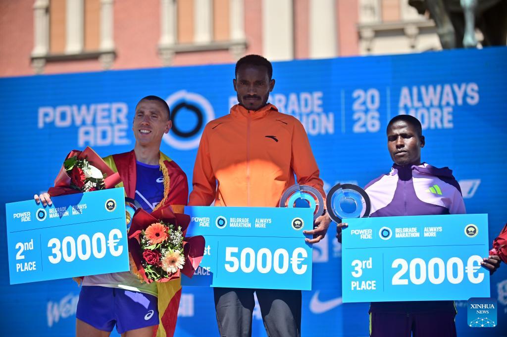 Silver medalist Northern Macedonia's Dario Ivanovski (L), gold medalist Ethiopia's Gada Gemsisa Gudeta (C) and bronze medalist Kenya's Johana Erot pose for photos during the awarding ceremony for men's marathon event at the 39th Belgrade marathon in Belgrade, Serbia, on April 19, 2026. (Photo by Predrag Milosavljevic/Xinhua)