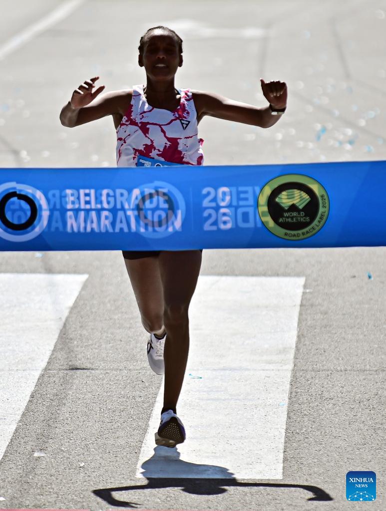 Gold medalist Ethiopia's Eden Alemu Dadi crosses the finishing line and crowns the women's title during the 39th Belgrade marathon in Belgrade, Serbia, on April 19, 2026. (Photo by Predrag Milosavljevic/Xinhua)