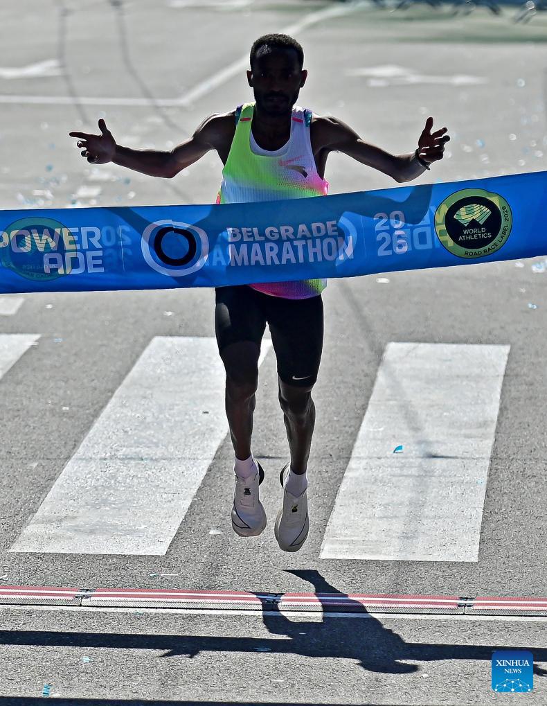 Gold medalist Ethiopia's Gada Gemsisa Gudeta crosses the finishing line and crowns the men's title during the 39th Belgrade marathon in Belgrade, Serbia, on April 19, 2026. (Photo by Predrag Milosavljevic/Xinhua)