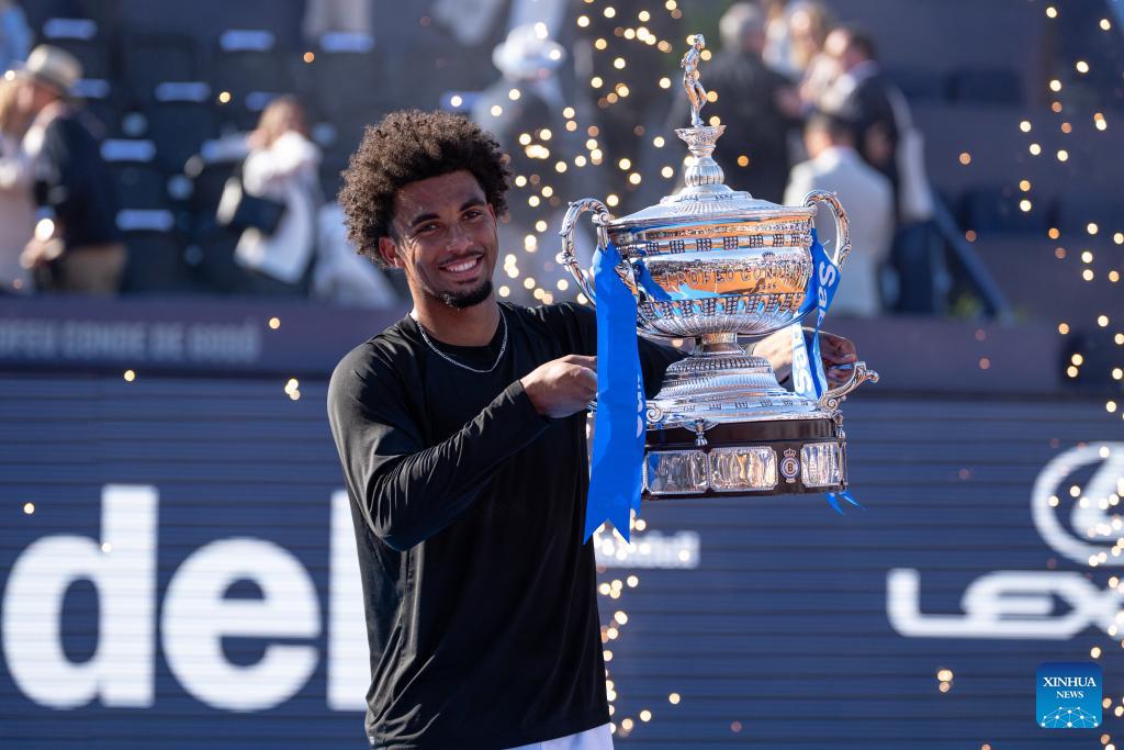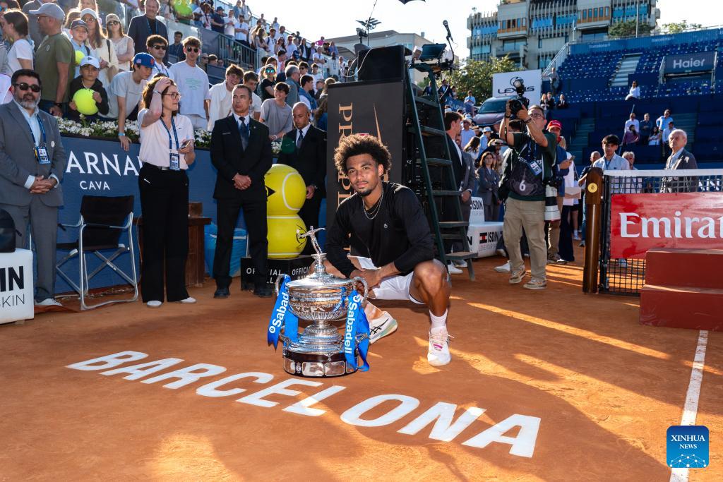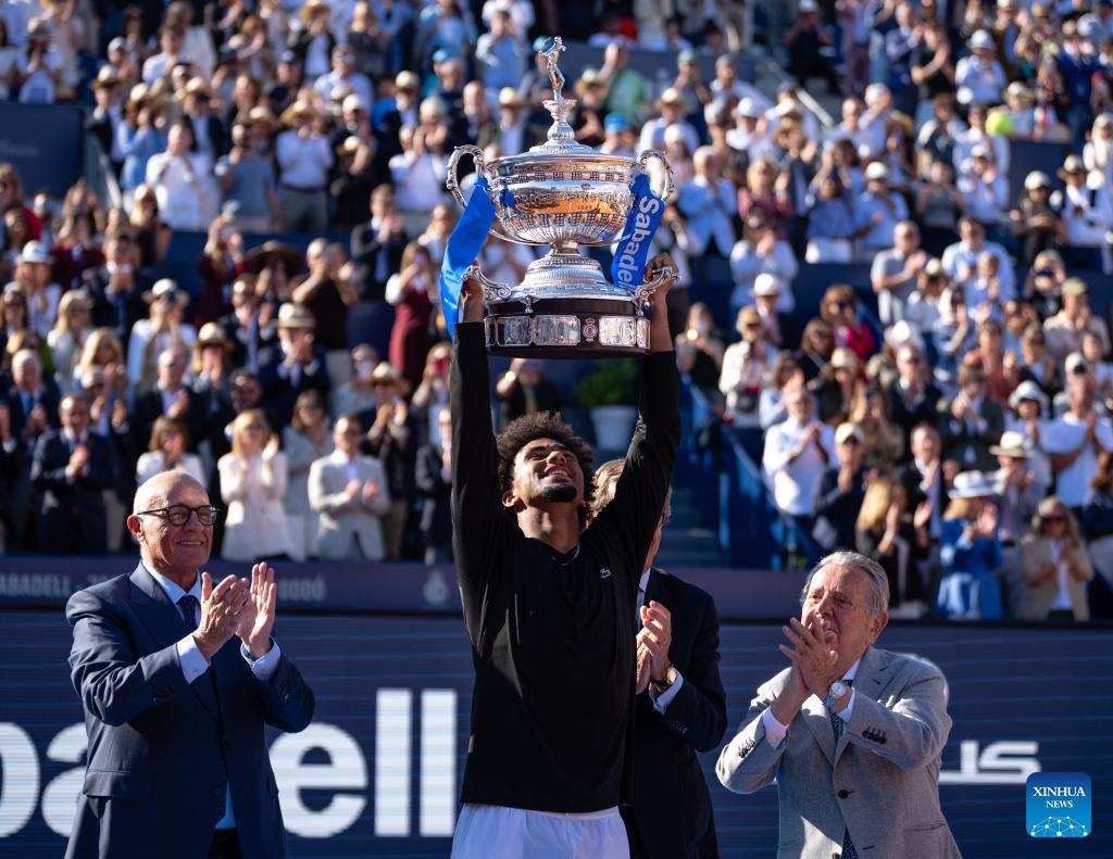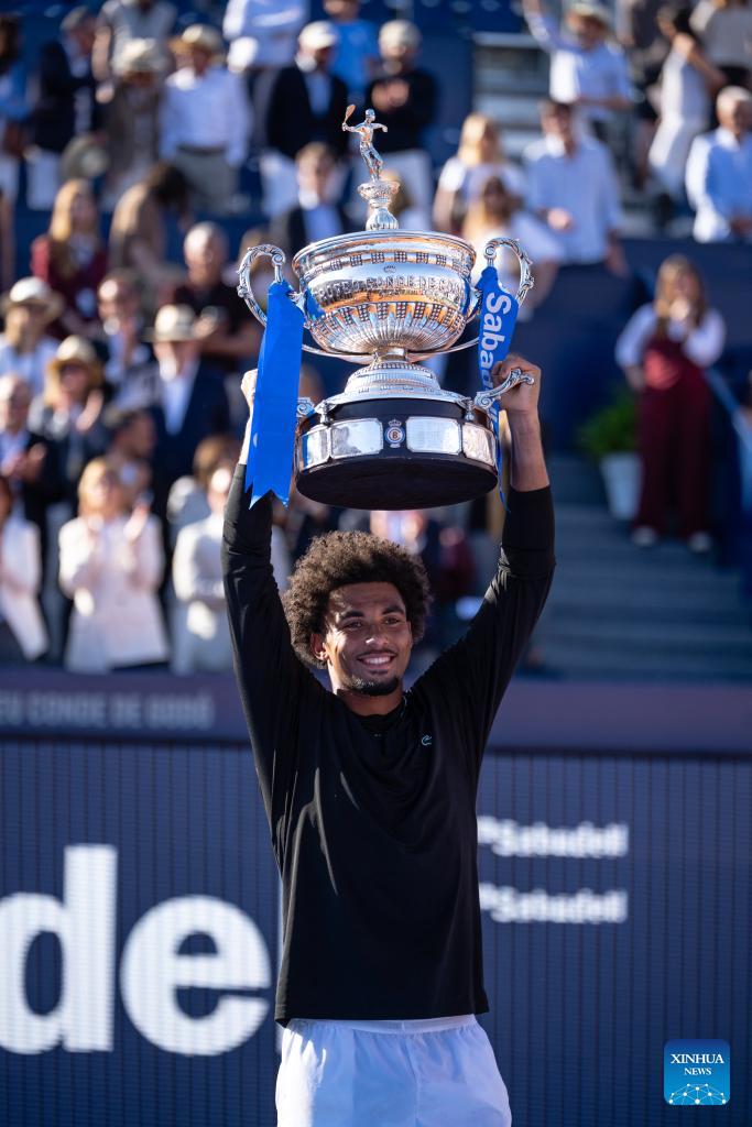Arthur Fils of France poses with the trophy during the awarding ceremony for the men's singles final tennis match between Arthur Fils of France and Andrey Rublev of Russia at the ATP Barcelona Open Banc Sabadell 2026 in Barcelona, Spain, on April 19, 2026. (Photo by Joan Gosa/Xinhua)