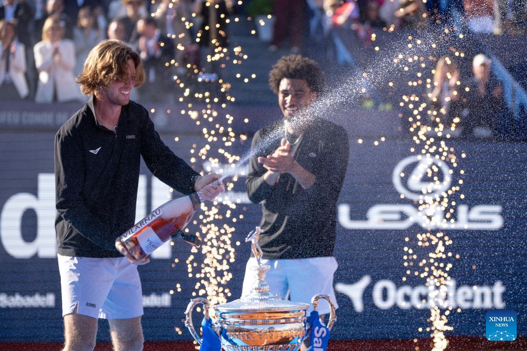 Arthur Fils (R) of France and Andrey Rublev of Russia celebrate during the awarding ceremony for the men's singles final tennis match between Arthur Fils of France and Andrey Rublev of Russia at the ATP Barcelona Open Banc Sabadell 2026 in Barcelona, Spain, on April 19, 2026. (Photo by Joan Gosa/Xinhua)