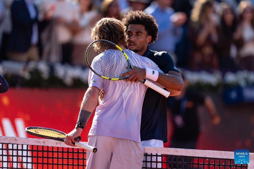 Arthur Fils (R) of France hugs Andrey Rublev of Russia after the men's singles final tennis match between Arthur Fils of France and Andrey Rublev of Russia at the ATP Barcelona Open Banc Sabadell 2026 in Barcelona, Spain, on April 19, 2026. (Photo by Joan Gosa/Xinhua)