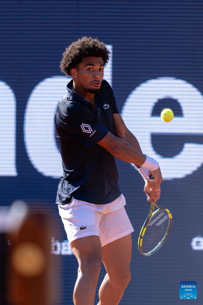 Arthur Fils of France hits a return during the men's singles final tennis match between Arthur Fils of France and Andrey Rublev of Russia at the ATP Barcelona Open Banc Sabadell 2026 in Barcelona, Spain, on April 19, 2026. (Photo by Joan Gosa/Xinhua)