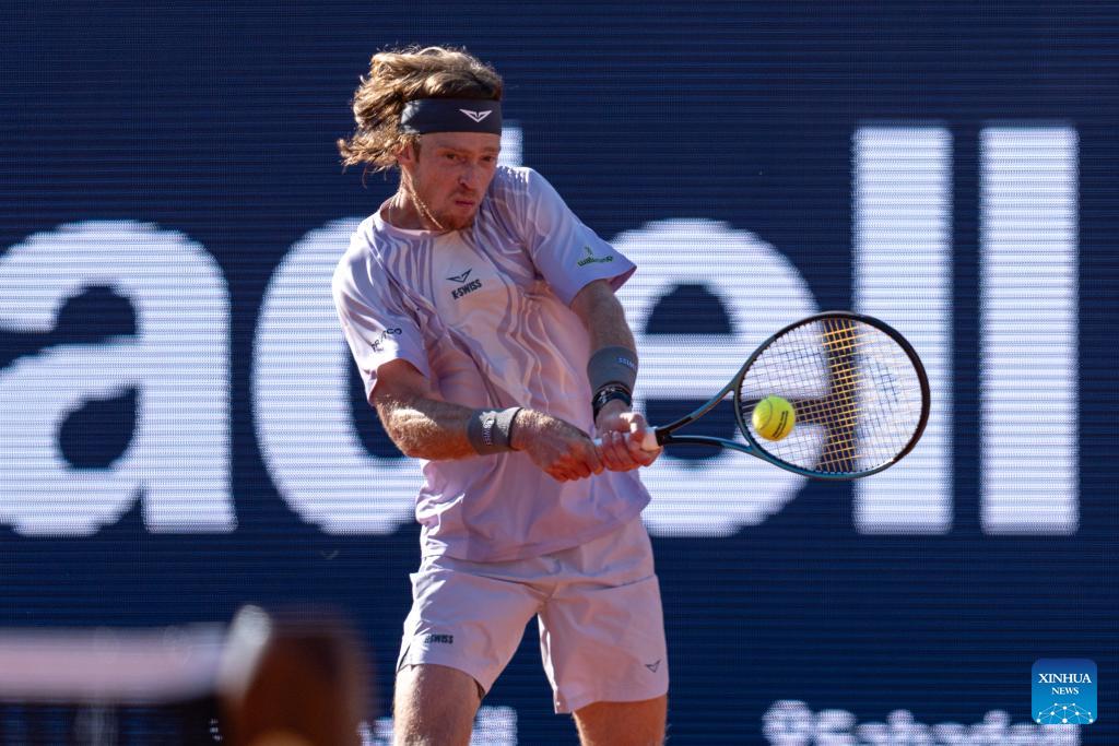 Andrey Rublev of Russia hits a return during the men's singles final tennis match between Arthur Fils of France and Andrey Rublev of Russia at the ATP Barcelona Open Banc Sabadell 2026 in Barcelona, Spain, on April 19, 2026. (Photo by Joan Gosa/Xinhua)