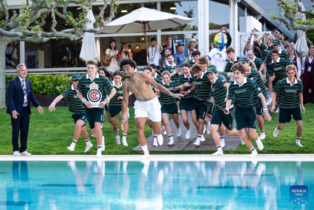 Arthur Fils of France celebrates victory with ball kids after winning the men's singles final tennis match between Arthur Fils of France and Andrey Rublev of Russia at the ATP Barcelona Open Banc Sabadell 2026 in Barcelona, Spain, on April 19, 2026. (Photo by Joan Gosa/Xinhua)