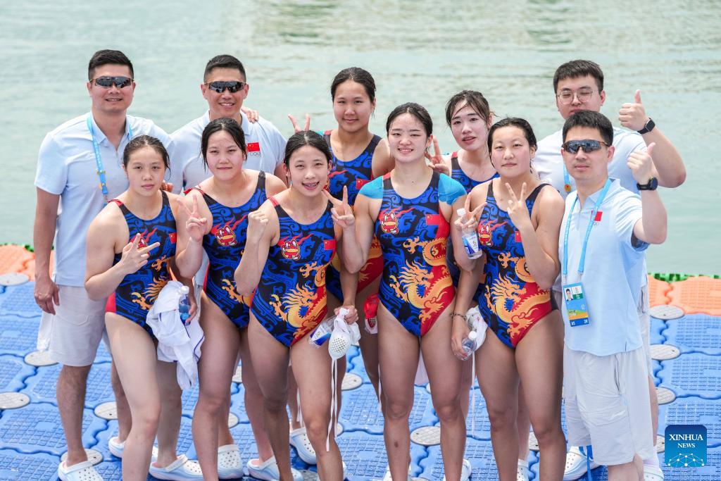 Players and coaches of China pose for photos after the water polo women's round-robin final match between China and China's Hong Kong at the 6th Asian Beach Games in Sanya, south China's Hainan Province, April 22, 2026. (Xinhua/Chen Sihan)