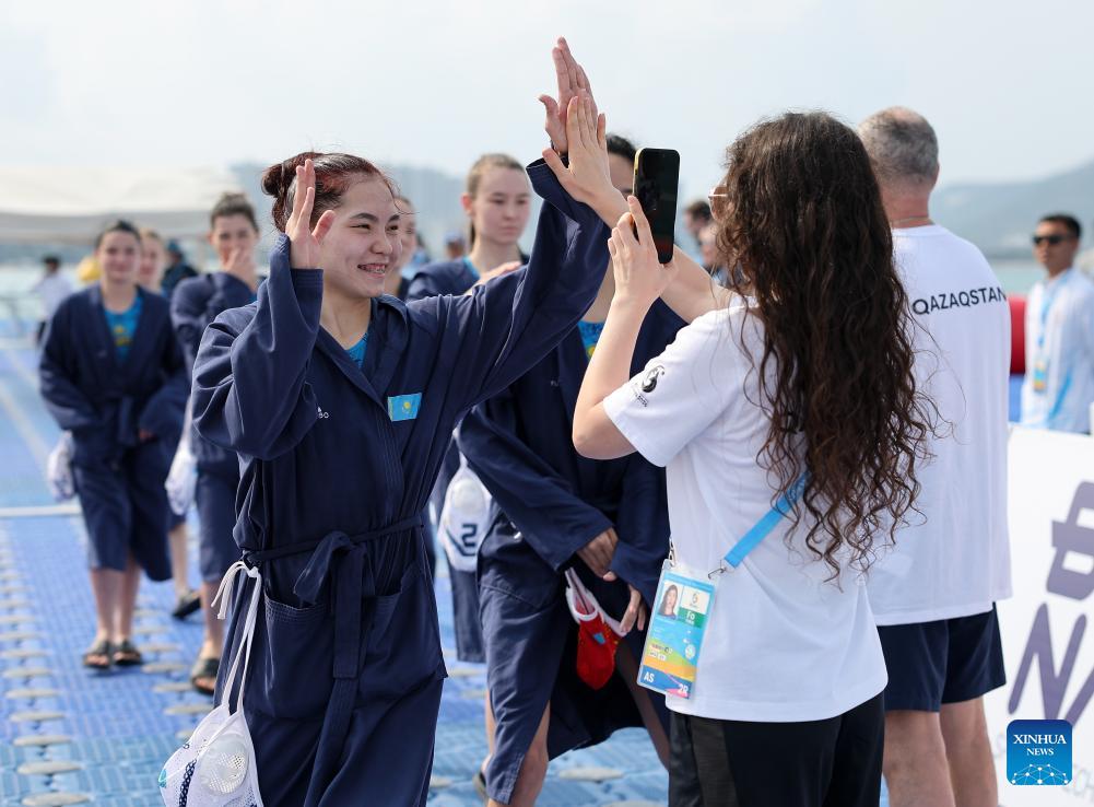 Players of Kazakhstan enter the venue before the water polo women's round-robin final match between Kazakhstan and Thailand at the 6th Asian Beach Games in Sanya, south China's Hainan Province, April 22, 2026. (Xinhua/Zhu Weixi)