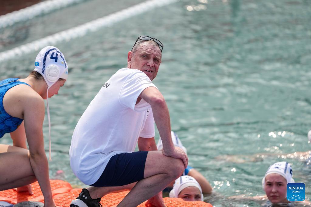 Andrey Sazykin (R, top), head coach of Kazakhstan, reacts during the water polo women's round-robin final match between Kazakhstan and Thailand at the 6th Asian Beach Games in Sanya, south China's Hainan Province, April 22, 2026. (Xinhua/Chen Sihan)