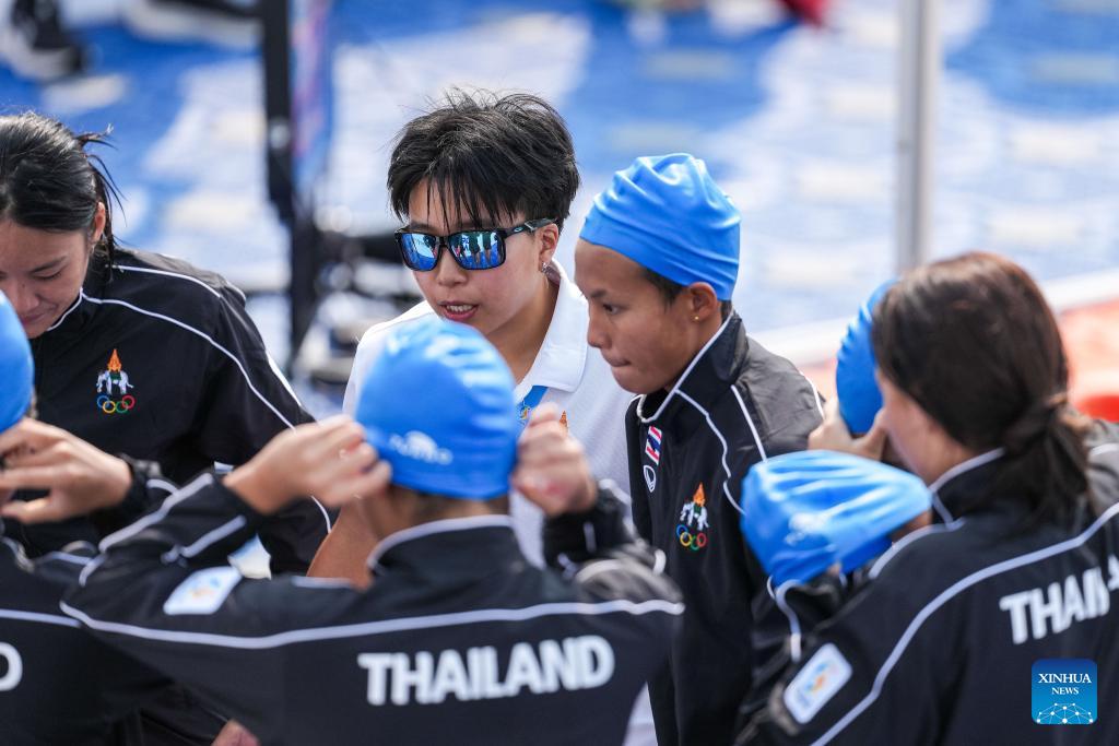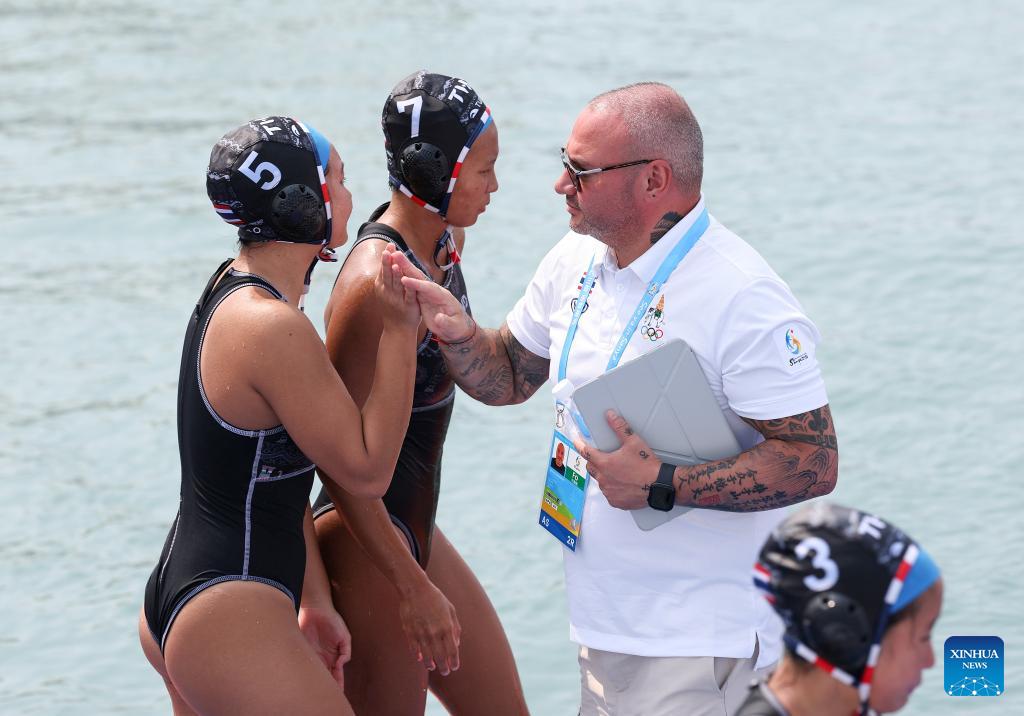 Sarocha Rewrujirek (C, top), head coach of Thailand, gives instructions to the players during the water polo women's round-robin final match between Kazakhstan and Thailand at the 6th Asian Beach Games in Sanya, south China's Hainan Province, April 22, 2026. (Xinhua/Chen Sihan)