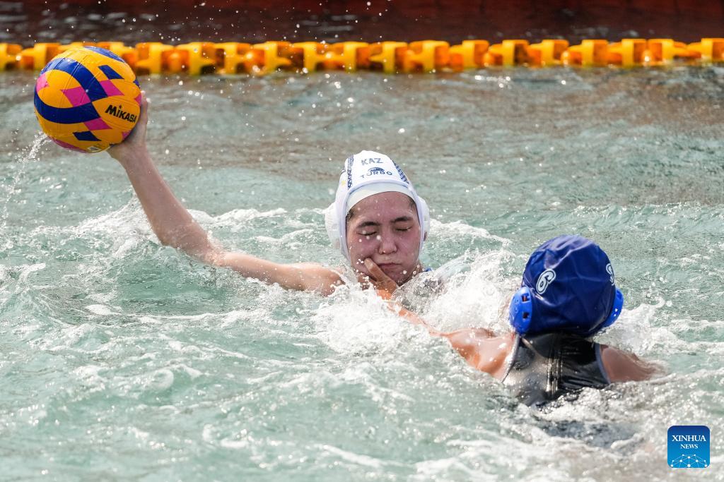 Aida Alpysbay (front) of Kazakhstan competes during the water polo women's round-robin final match between Kazakhstan and Thailand at the 6th Asian Beach Games in Sanya, south China's Hainan Province, April 22, 2026. (Xinhua/Zhu Weixi)