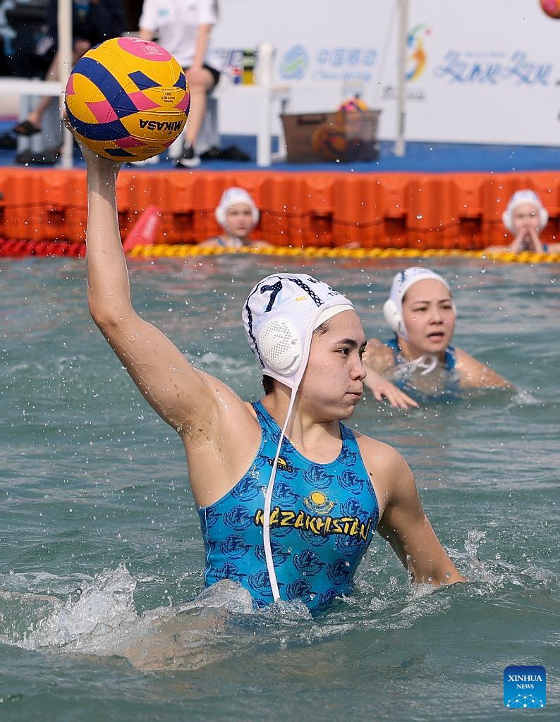 Aida Alpysbay of Kazakhstan competes during the water polo women's round-robin final match between Kazakhstan and Thailand at the 6th Asian Beach Games in Sanya, south China's Hainan Province, April 22, 2026. (Xinhua/Chen Sihan)