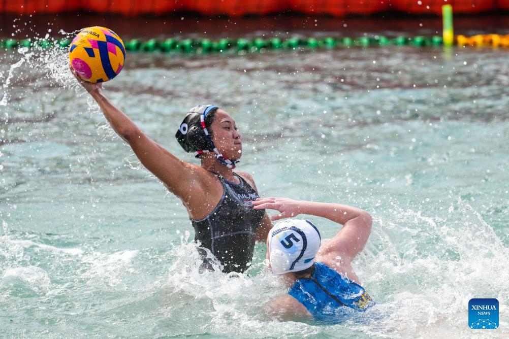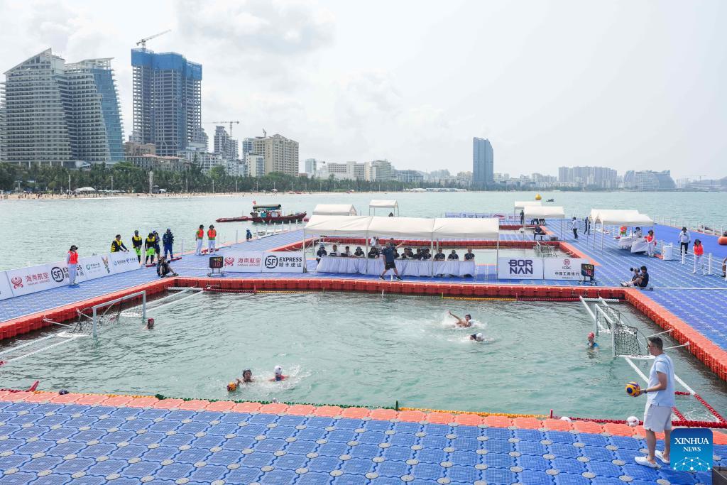 Players of both teams compete in the open air pool during the water polo women's round-robin final match between China and China's Hong Kong at the 6th Asian Beach Games in Sanya, south China's Hainan Province, April 22, 2026. (Xinhua/Chen Sihan)