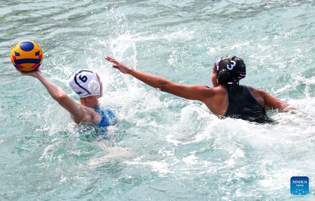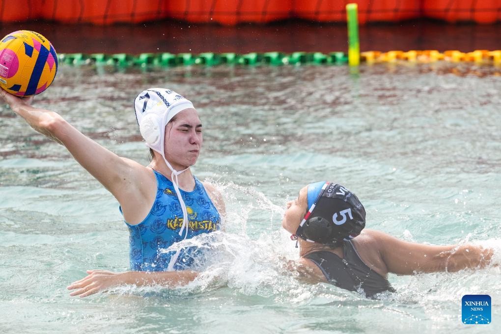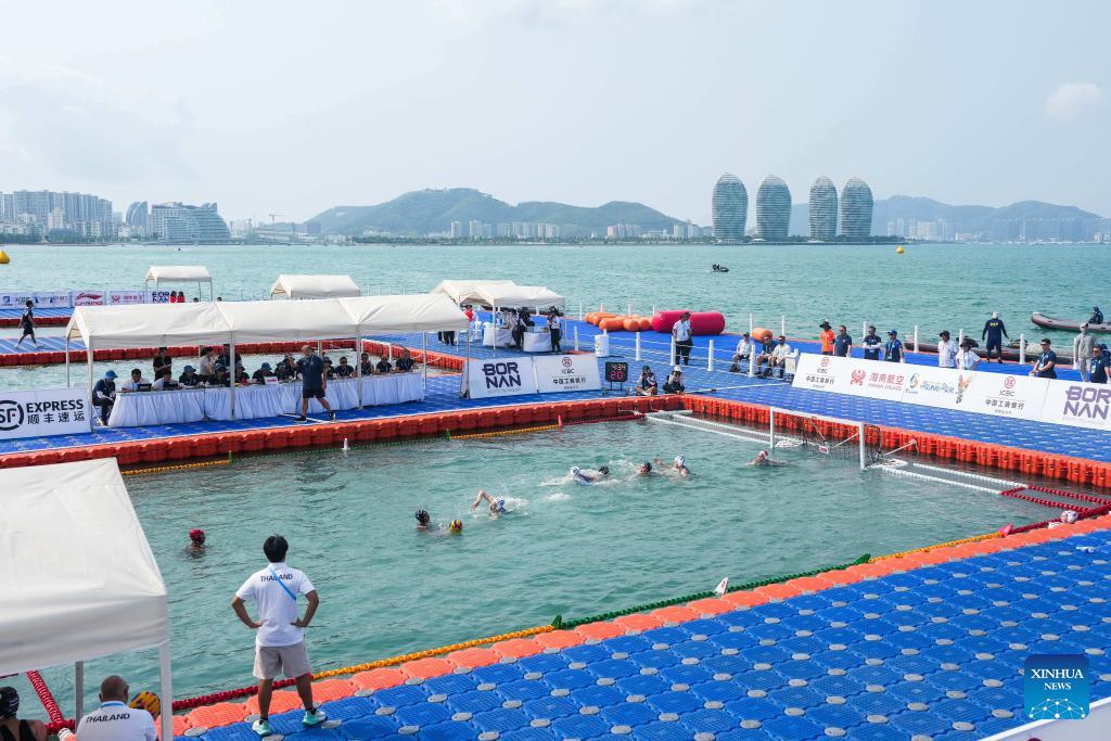 Players of both teams compete in the open air pool during the water polo women's round-robin final match between Kazakhstan and Thailand at the 6th Asian Beach Games in Sanya, south China's Hainan Province, April 22, 2026. (Xinhua/Chen Sihan)