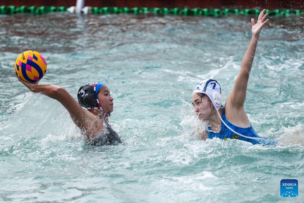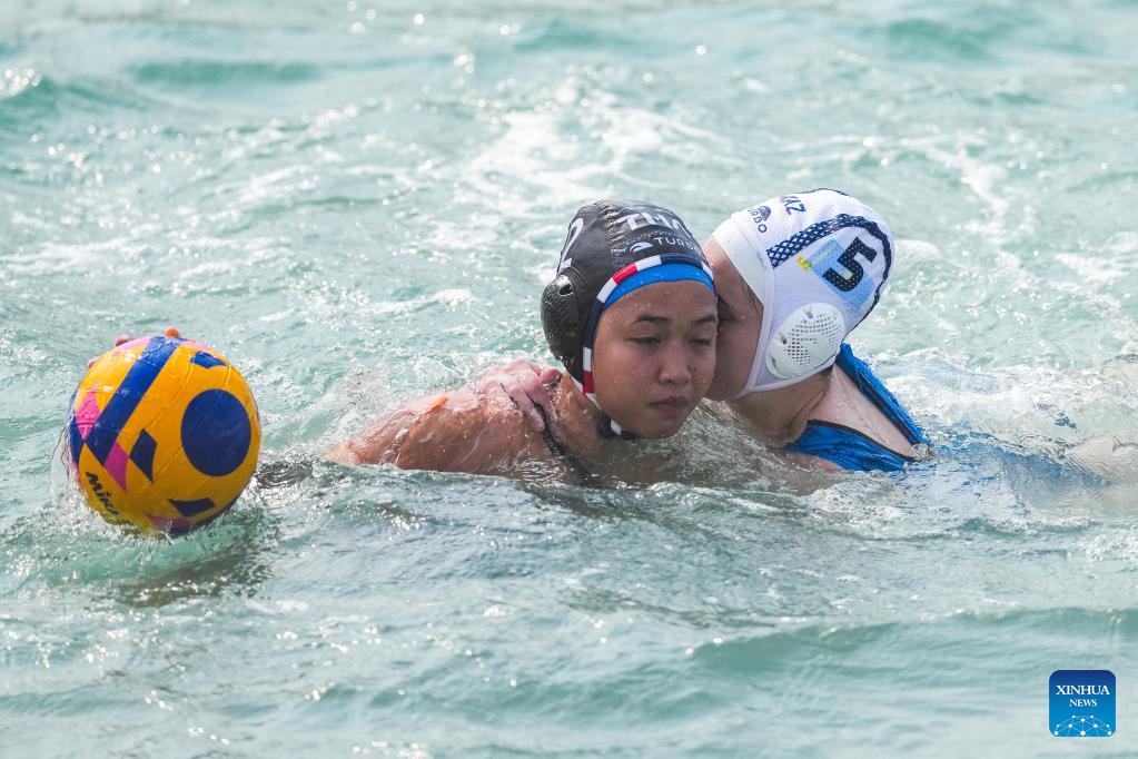 Aida Alpysbay (L) of Kazakhstan competes during the water polo women's round-robin final match between Kazakhstan and Thailand at the 6th Asian Beach Games in Sanya, south China's Hainan Province, April 22, 2026. (Xinhua/Chen Sihan)