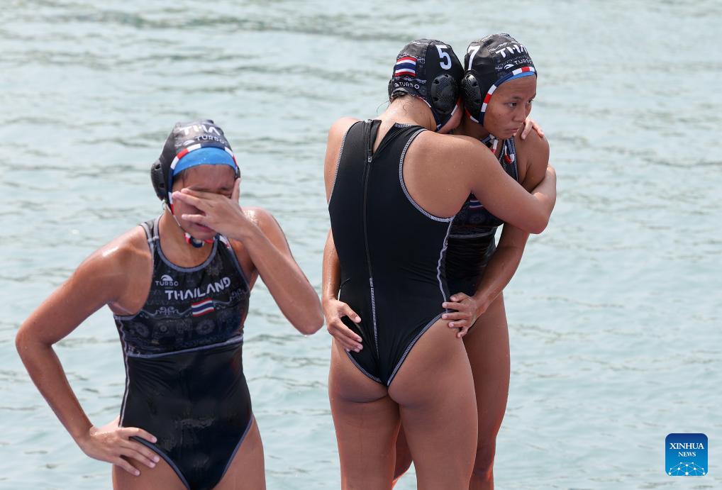 Players of Thailand comfort each other after the water polo women's round-robin final match between Kazakhstan and Thailand at the 6th Asian Beach Games in Sanya, south China's Hainan Province, April 22, 2026. (Xinhua/Zhu Weixi)