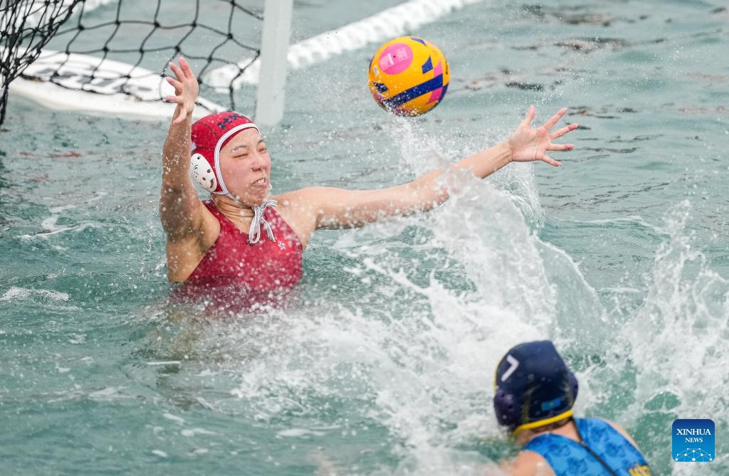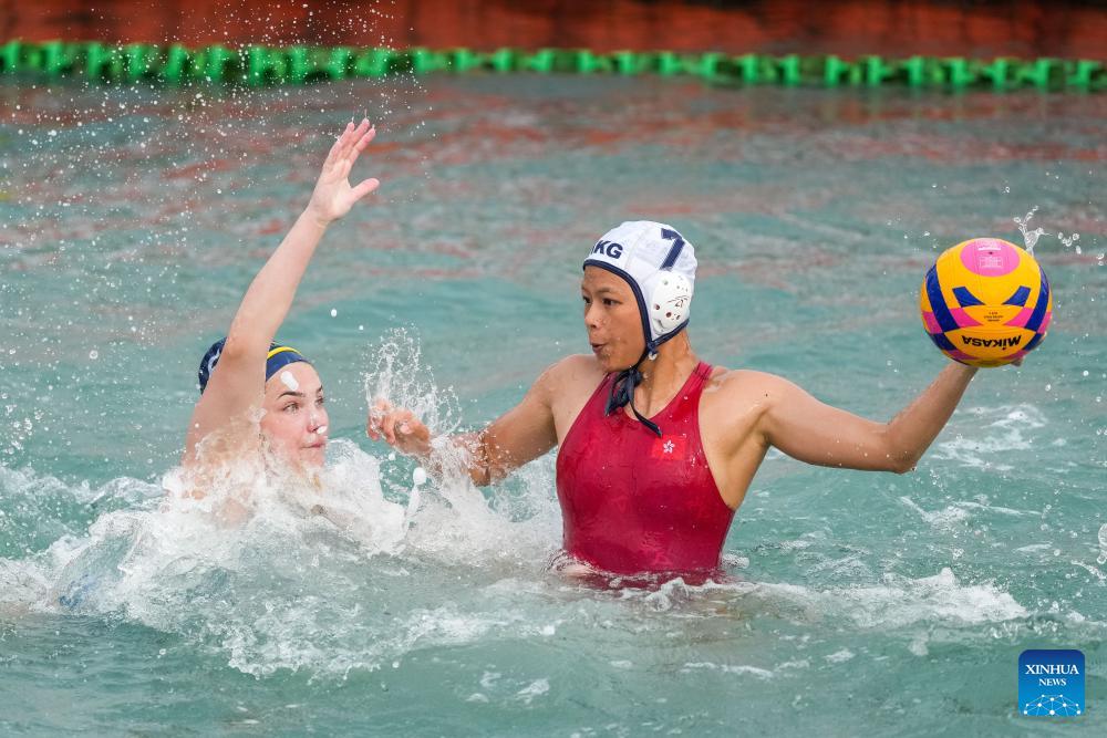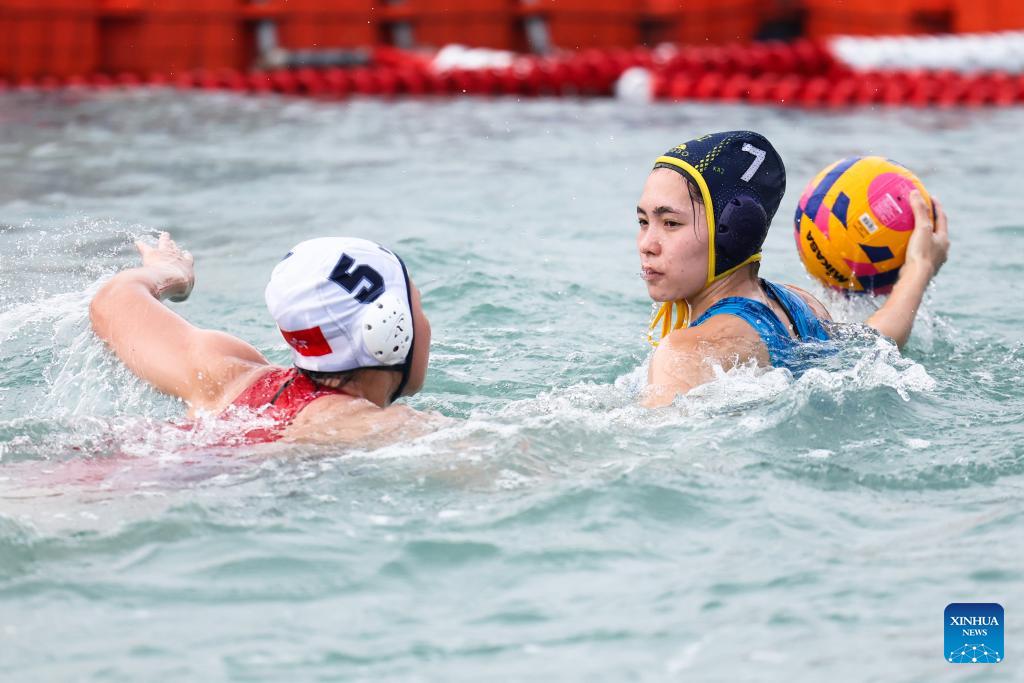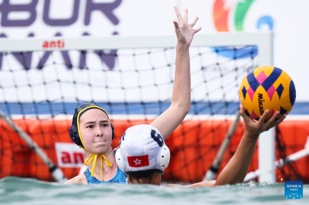 Ng Hau Laam Fran (R) of China's Hong Kong competes during the water polo women's round-robin final match between China's Hong Kong and Kazakhstan at the 6th Asian Beach Games in Sanya, south China's Hainan Province, April 23, 2026. (Xinhua/Zhu Weixi)