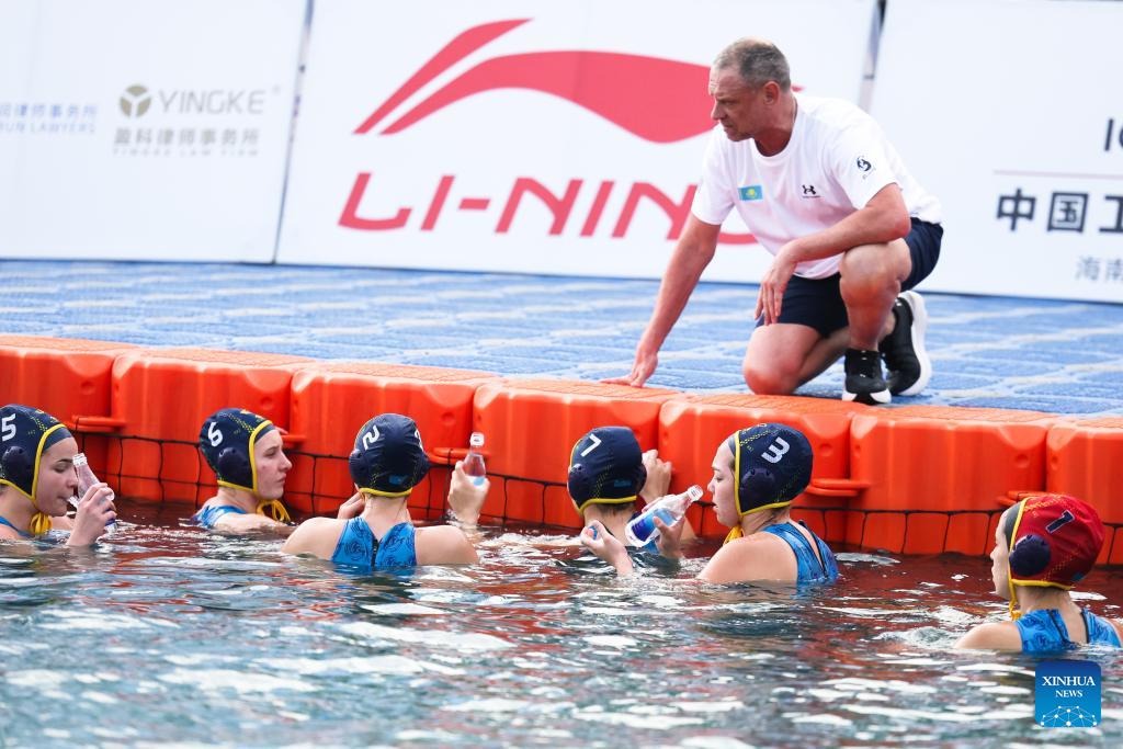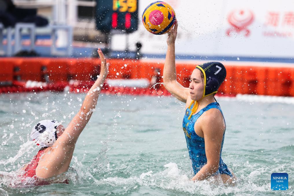Aida Alpysbay (R) of Kazakhstan competes during the water polo women's round-robin final match between China's Hong Kong and Kazakhstan at the 6th Asian Beach Games in Sanya, south China's Hainan Province, April 23, 2026. (Xinhua/Zhu Weixi)