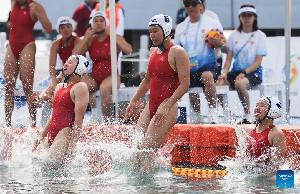 Players of China's Hong Kong jump into the water before the water polo women's round-robin final match between China's Hong Kong and Kazakhstan at the 6th Asian Beach Games in Sanya, south China's Hainan Province, April 23, 2026. (Xinhua/Zhu Weixi)