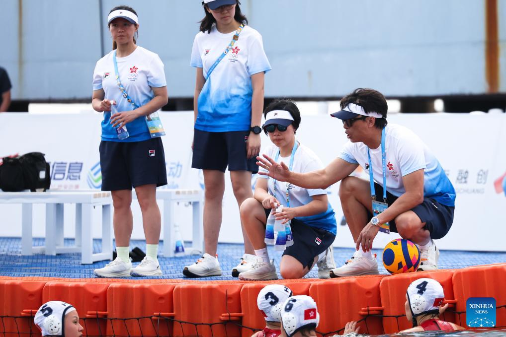 Zhao Jinwen (R), coach of China's Hong Kong, reacts during the water polo women's round-robin final match between China's Hong Kong and Kazakhstan at the 6th Asian Beach Games in Sanya, south China's Hainan Province, April 23, 2026. (Xinhua/Zhu Weixi)