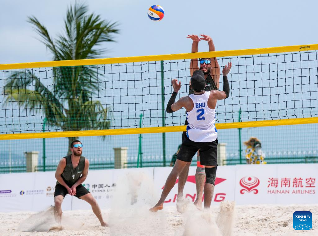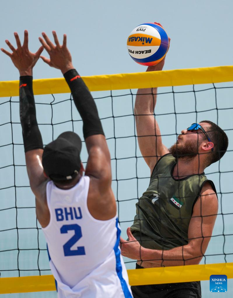 Orwa Alsakka (R) of Syria competes during the beach volleyball men's preliminary pool G match between Jurme Rangdal/Tshering Dorji of Bhutan and Orwa Alsakka/Kutiba Albirini of Syria at the 6th Asian Beach Games in Sanya, south China's Hainan Province, April 23, 2026. (Xinhua/Jigme Dorje)