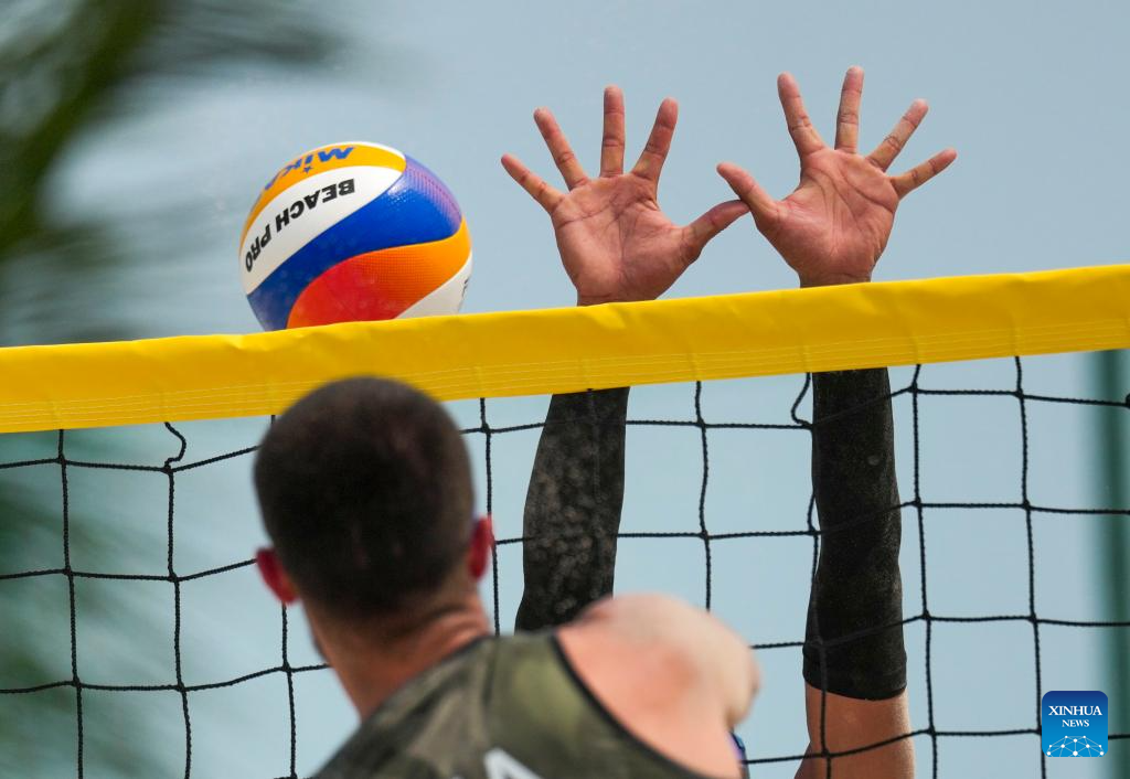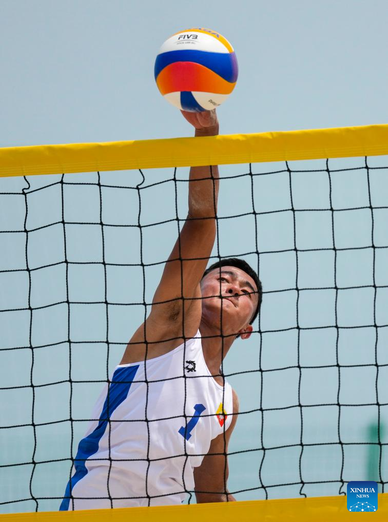 Jurme Rangdal of Bhutan competes during the beach volleyball men's preliminary pool G match between Jurme Rangdal/Tshering Dorji of Bhutan and Orwa Alsakka/Kutiba Albirini of Syria at the 6th Asian Beach Games in Sanya, south China's Hainan Province, April 23, 2026. (Xinhua/Jigme Dorje)