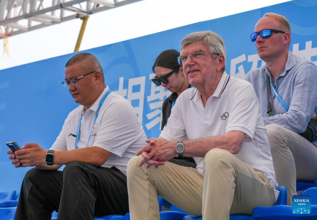 International Olympic Committee (IOC) Honorary President for Life Thomas Bach (R, front) watches the beach volleyball competitions at the 6th Asian Beach Games in Sanya, south China's Hainan Province, April 23, 2026. (Xinhua/Jigme Dorje)
