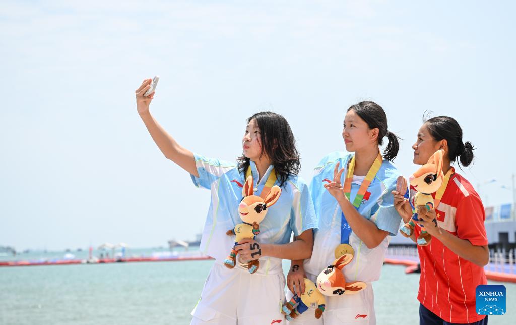 Gold medalist Li Xinxuan (C) of China, silver medalist Chen Yijing (L) of China and bronze medalist Vo Thi My Tien of Vietnam take selfies during the awarding ceremony for the women's 5km final of open water swimming at the 6th Asian Beach Games in Sanya, south China's Hainan Province, April 25, 2026. (Xinhua/Bei He)