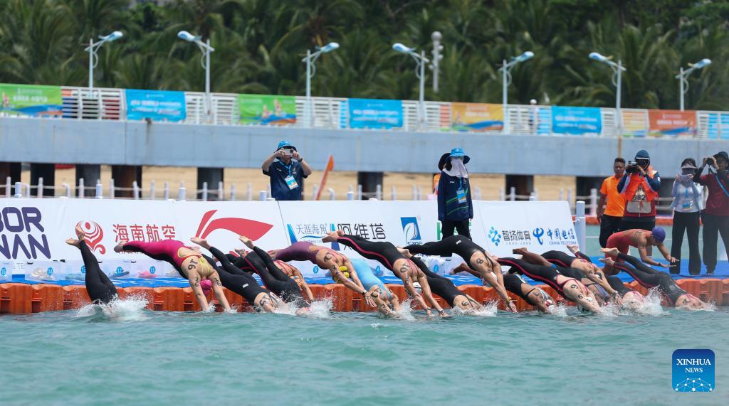 Swimmers start during the women's 5km final of open water swimming at the 6th Asian Beach Games in Sanya, south China's Hainan Province, April 25, 2026. (Photo by Ma Zihan/Xinhua)
